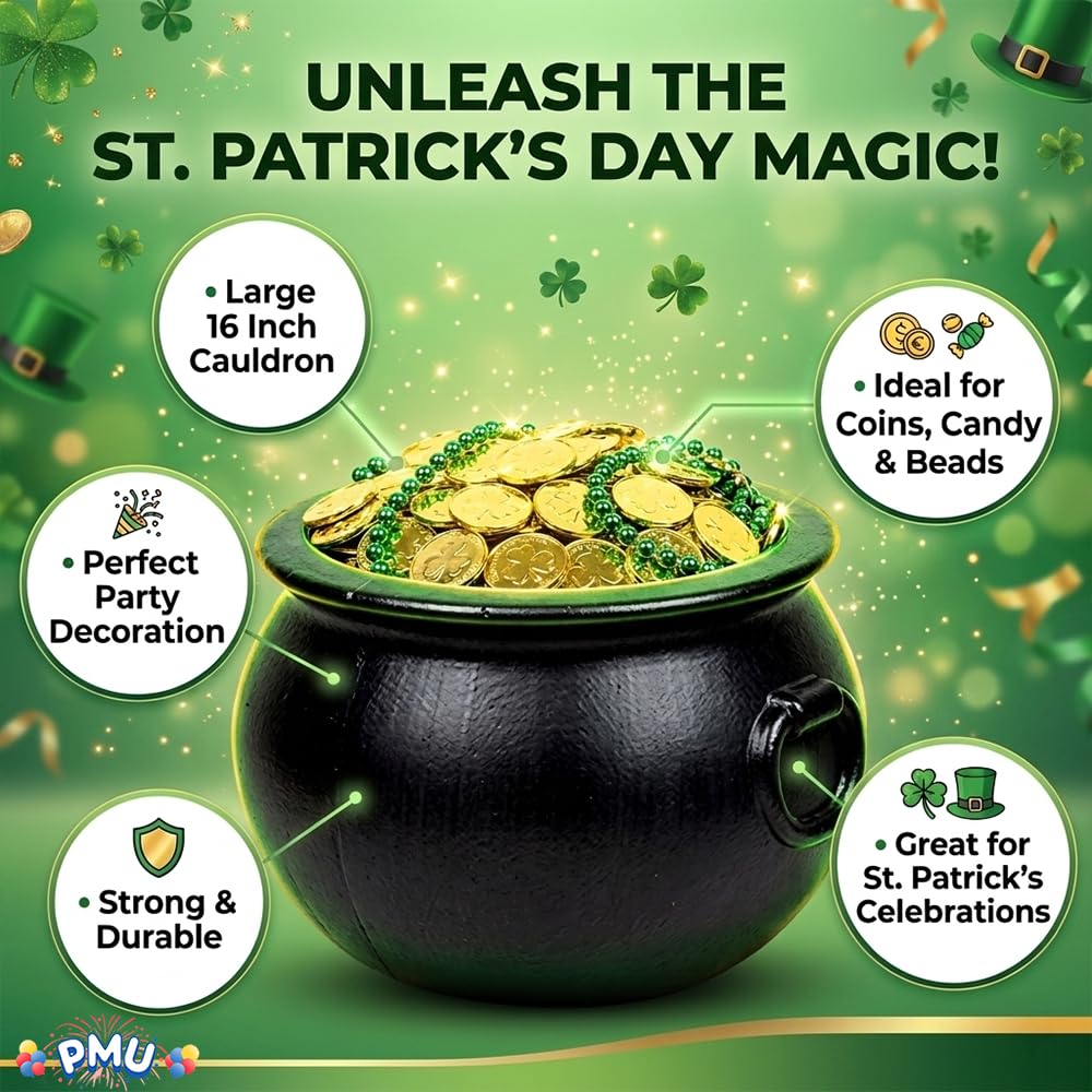 - Festive St. Patrick’s Day Cauldron: This cauldron adds an instant festive charm to St. Patrick’s Day celebrations, leprechaun themes, Mardi Gras events, and seasonal party décor setups.