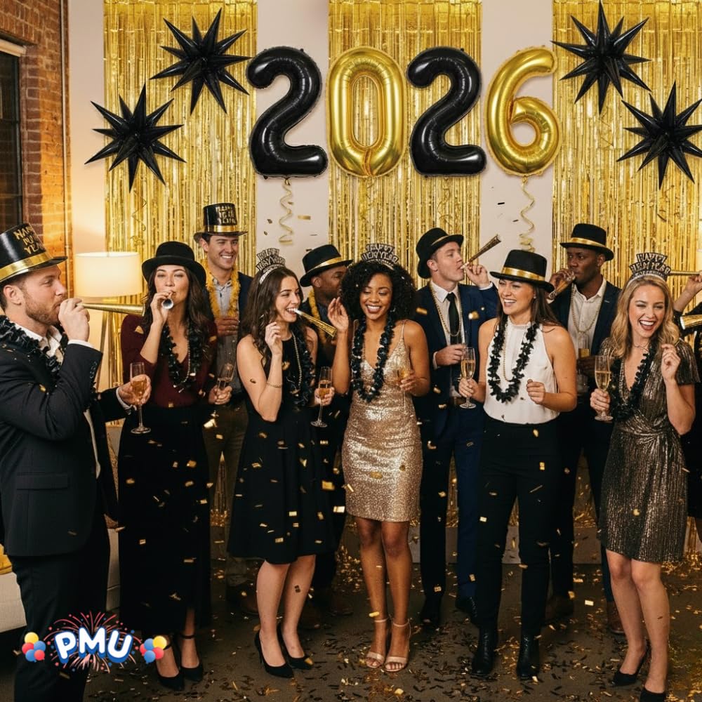 - ππππππππ πππ ππππ πππππ πππ: The Value Party Supply Kit for nye decorations 2026 includes 50 plastic Top Hats and Derbies, 50 Happy New Year Tiaras, 100 Foil Horns 9β , 25 Metallic Beads ,25 Hawaiian Poly Leis , 1 set of 2026 40in Black And Gold Mylar, 3 Curtains (3 ft x 8ft each), and 4 Black Mylar Star Foil Balloon 22 inch. A Grand Total Of 261 units.